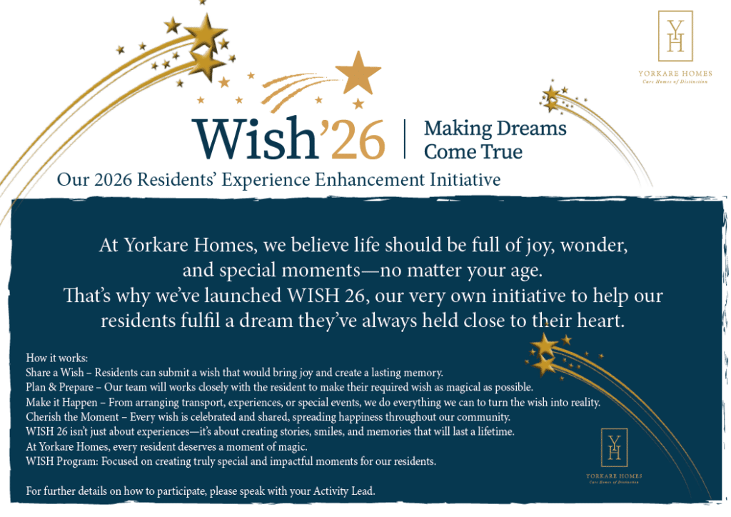 At Yorkare Homes, we are committed to delivering outstanding, person-centred care. Our 2026 Care Home Initiatives – Challenge 26 and Wish 26 – are designed to enhance resident wellbeing, strengthen community connections, and create meaningful experiences across all our care homes.